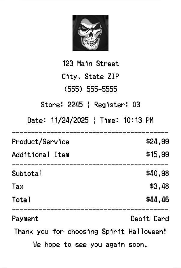 Create authentic Spirit Halloween receipts for party supplies purchases. Our free receipt generator tool helps you create professional, detailed receipts instantly. Perfect for business expense tracking, reimbursement requests, and personal documentation. Download high-quality PNG receipts in seconds, no signup required.