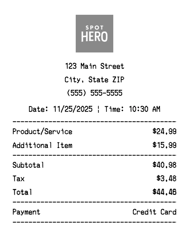 Create authentic SpotHero receipts instantly. Our free receipt generator produces professional parking receipts with company logo, itemized purchases, tax calculations, and payment details. Perfect for expense tracking, reimbursement, and documentation. Download high-quality PNG receipts in seconds.