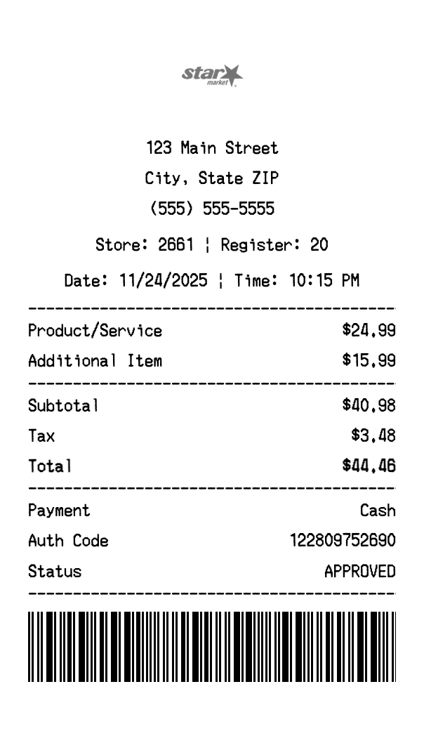 Our Star Market receipt generator creates professional receipts that match the authentic Star Market format. Each receipt includes the company logo, business information, transaction details, itemized purchase list, tax calculations, and payment information. All receipts are formatted to look exactly like real Star Market receipts, making them perfect for expense reports, tax documentation, and reimbursement purposes.