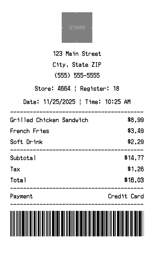 Our Starr Restaurants receipt generator creates professional receipts that match the authentic Starr Restaurants format. Each receipt includes the company logo, business information, transaction details, itemized purchase list, tax calculations, and payment information. All receipts are formatted to look exactly like real Starr Restaurants receipts, making them perfect for expense reports, tax documentation, and reimbursement purposes.