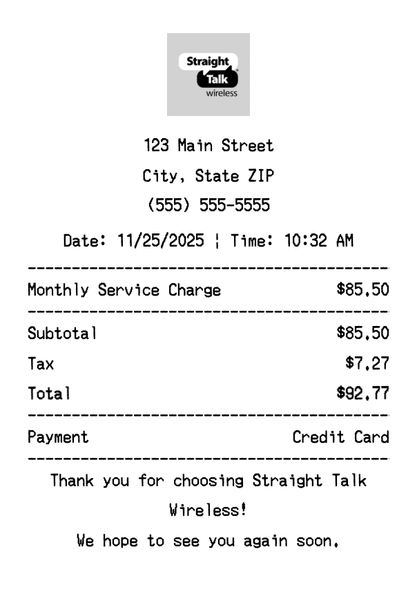 Create authentic Straight Talk Wireless receipts instantly. Our free receipt generator produces professional wireless receipts with company logo, itemized purchases, tax calculations, and payment details. Perfect for expense tracking, reimbursement, and documentation. Download high-quality PNG receipts in seconds.