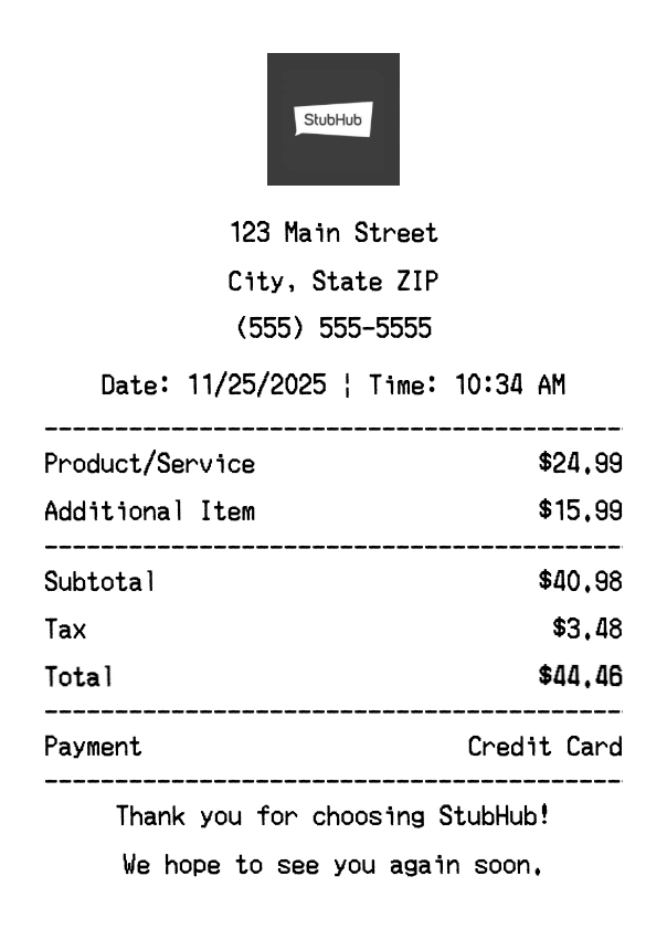Create authentic StubHub receipts instantly. Our free receipt generator produces professional ticketing receipts with company logo, itemized purchases, tax calculations, and payment details. Perfect for expense tracking, reimbursement, and documentation. Download high-quality PNG receipts in seconds.