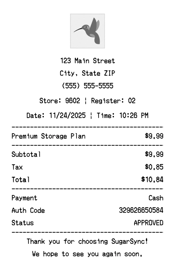 Create authentic SugarSync receipts instantly. Our free receipt generator produces professional cloud storage receipts with company logo, itemized purchases, tax calculations, and payment details. Perfect for expense tracking, reimbursement, and documentation. Download high-quality PNG receipts in seconds.