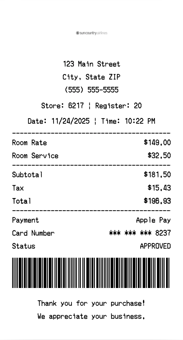 Create authentic Sun Country Airlines receipts for airline purchases. Our free receipt generator tool helps you create professional, detailed receipts instantly. Perfect for business expense tracking, reimbursement requests, and personal documentation. Download high-quality PNG receipts in seconds, no signup required.
