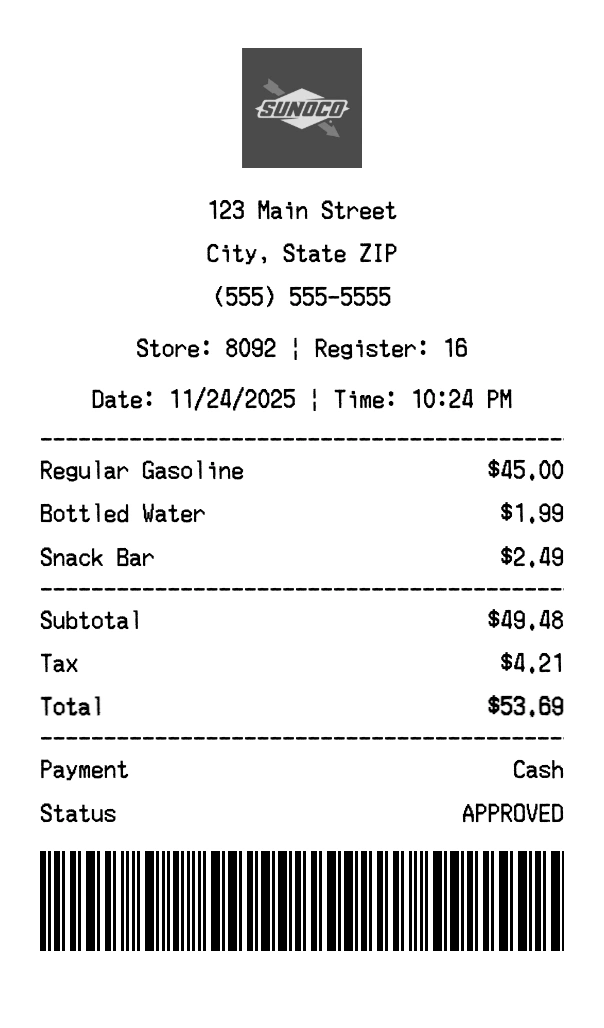 Create authentic Sunoco receipts for gas station purchases. Our free receipt generator tool helps you create professional, detailed receipts instantly. Perfect for business expense tracking, reimbursement requests, and personal documentation. Download high-quality PNG receipts in seconds, no signup required.