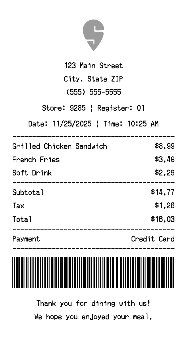 Create authentic Swiggy receipts for food delivery purchases. Our free receipt generator tool helps you create professional, detailed receipts instantly. Perfect for business expense tracking, reimbursement requests, and personal documentation. Download high-quality PNG receipts in seconds, no signup required.