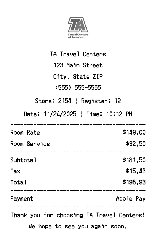 Create authentic TA Travel Centers receipts instantly. Our free receipt generator produces professional travel center receipts with company logo, itemized purchases, tax calculations, and payment details. Perfect for expense tracking, reimbursement, and documentation. Download high-quality PNG receipts in seconds.