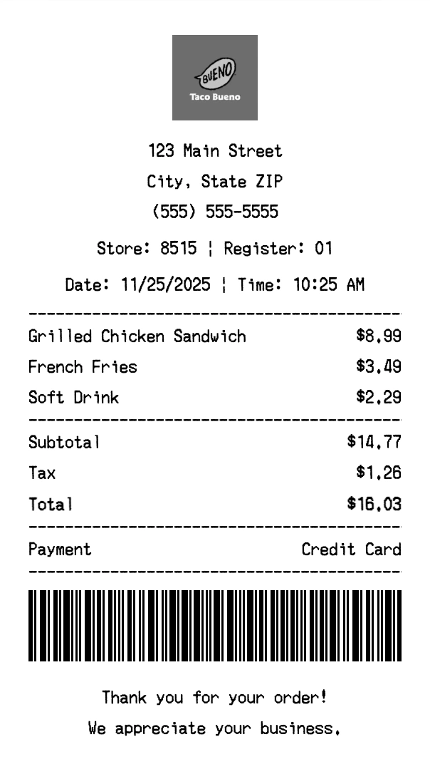 Create authentic Taco Bueno Restaurants receipts instantly. Our free receipt generator produces professional fast food receipts with company logo, itemized purchases, tax calculations, and payment details. Perfect for expense tracking, reimbursement, and documentation. Download high-quality PNG receipts in seconds.