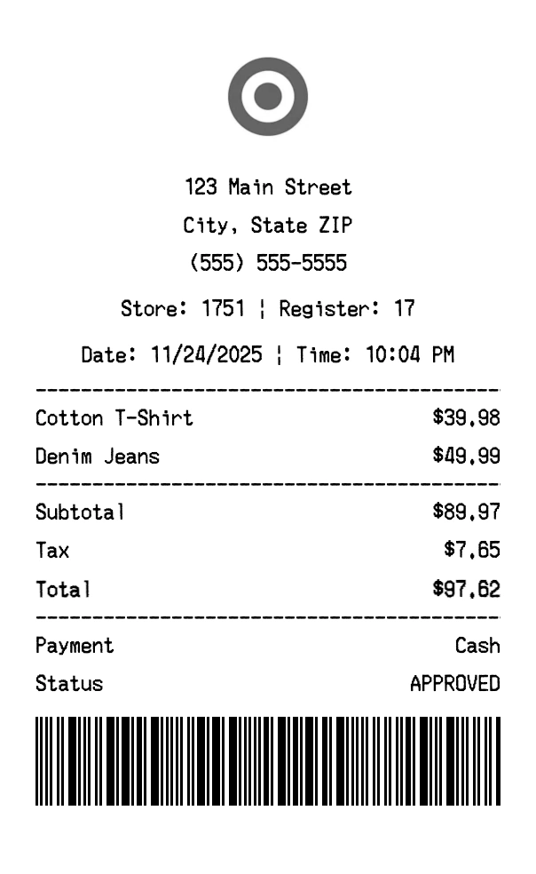 Create authentic Target receipts for general retail purchases. Our free receipt generator tool helps you create professional, detailed receipts instantly. Perfect for business expense tracking, reimbursement requests, and personal documentation. Download high-quality PNG receipts in seconds, no signup required.