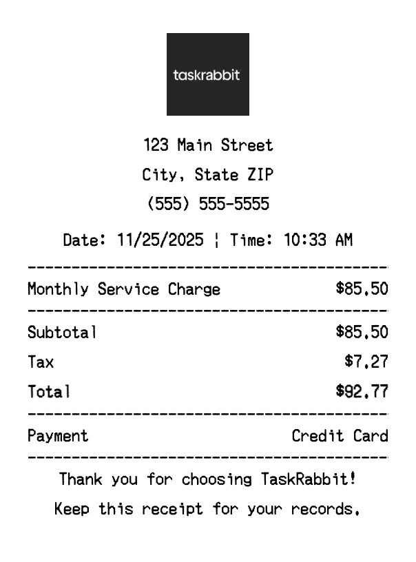 Create authentic TaskRabbit receipts instantly. Our free receipt generator produces professional home services receipts with company logo, itemized purchases, tax calculations, and payment details. Perfect for expense tracking, reimbursement, and documentation. Download high-quality PNG receipts in seconds.