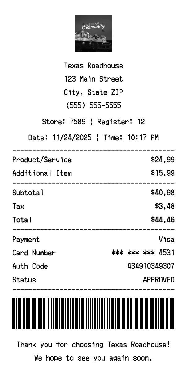 Our Texas Roadhouse receipt generator creates professional receipts that match the authentic Texas Roadhouse format. Each receipt includes the company logo, business information, transaction details, itemized purchase list, tax calculations, and payment information. All receipts are formatted to look exactly like real Texas Roadhouse receipts, making them perfect for expense reports, tax documentation, and reimbursement purposes.