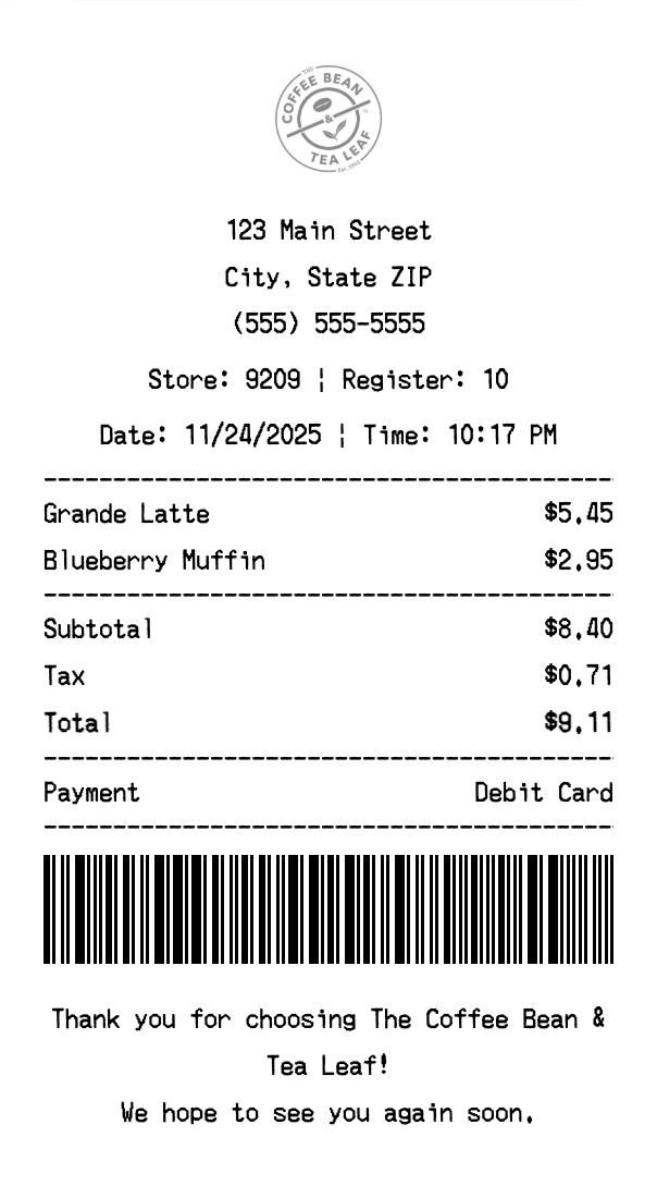 Create authentic The Coffee Bean & Tea Leaf receipts instantly. Our free receipt generator produces professional coffee receipts with company logo, itemized purchases, tax calculations, and payment details. Perfect for expense tracking, reimbursement, and documentation. Download high-quality PNG receipts in seconds.