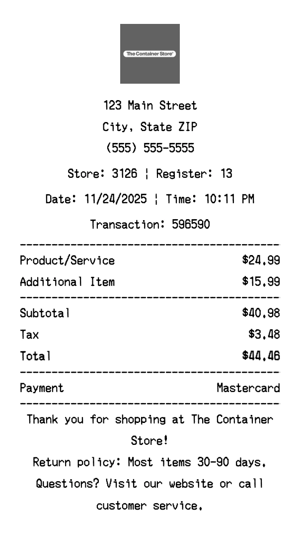 Create authentic The Container Store receipts for home goods purchases. Our free receipt generator tool helps you create professional, detailed receipts instantly. Perfect for business expense tracking, reimbursement requests, and personal documentation. Download high-quality PNG receipts in seconds, no signup required.