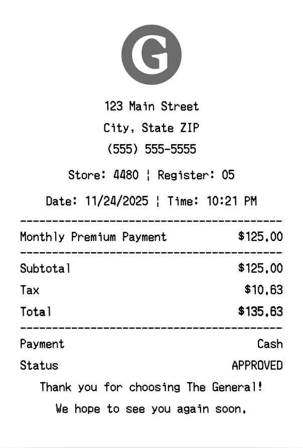 Create authentic The General receipts for insurance purchases. Our free receipt generator tool helps you create professional, detailed receipts instantly. Perfect for business expense tracking, reimbursement requests, and personal documentation. Download high-quality PNG receipts in seconds, no signup required.