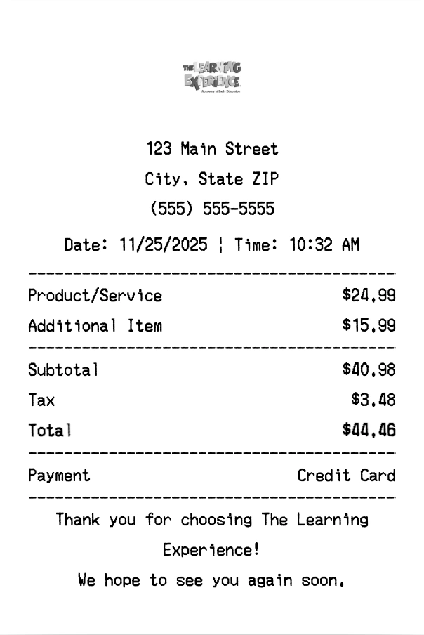 Create authentic The Learning Experience receipts instantly. Our free receipt generator produces professional childcare receipts with company logo, itemized purchases, tax calculations, and payment details. Perfect for expense tracking, reimbursement, and documentation. Download high-quality PNG receipts in seconds.