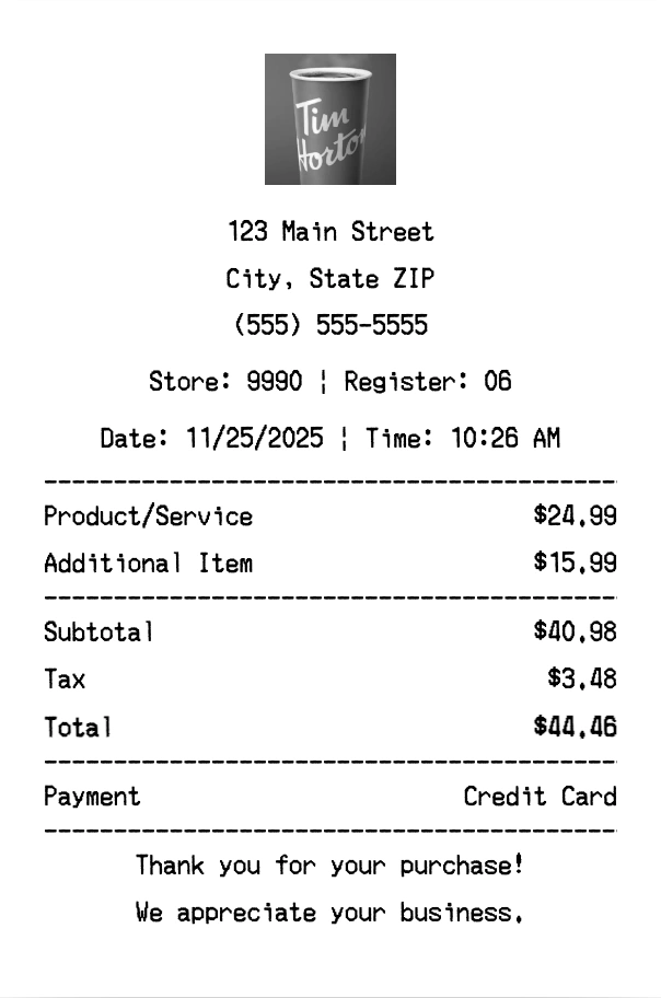 Create authentic Tim Hortons receipts for coffee purchases. Our free receipt generator tool helps you create professional, detailed receipts instantly. Perfect for business expense tracking, reimbursement requests, and personal documentation. Download high-quality PNG receipts in seconds, no signup required.
