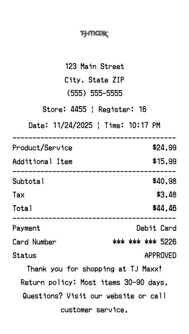 Our TJ Maxx receipt generator creates professional receipts that match the authentic TJ Maxx format. Each receipt includes the company logo, business information, transaction details, itemized purchase list, tax calculations, and payment information. All receipts are formatted to look exactly like real TJ Maxx receipts, making them perfect for expense reports, tax documentation, and reimbursement purposes.