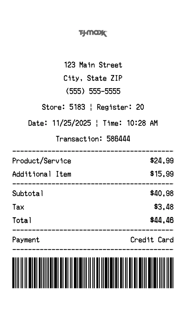 Create authentic T.J.Maxx receipts instantly. Our free receipt generator produces professional discount store receipts with company logo, itemized purchases, tax calculations, and payment details. Perfect for expense tracking, reimbursement, and documentation. Download high-quality PNG receipts in seconds.
