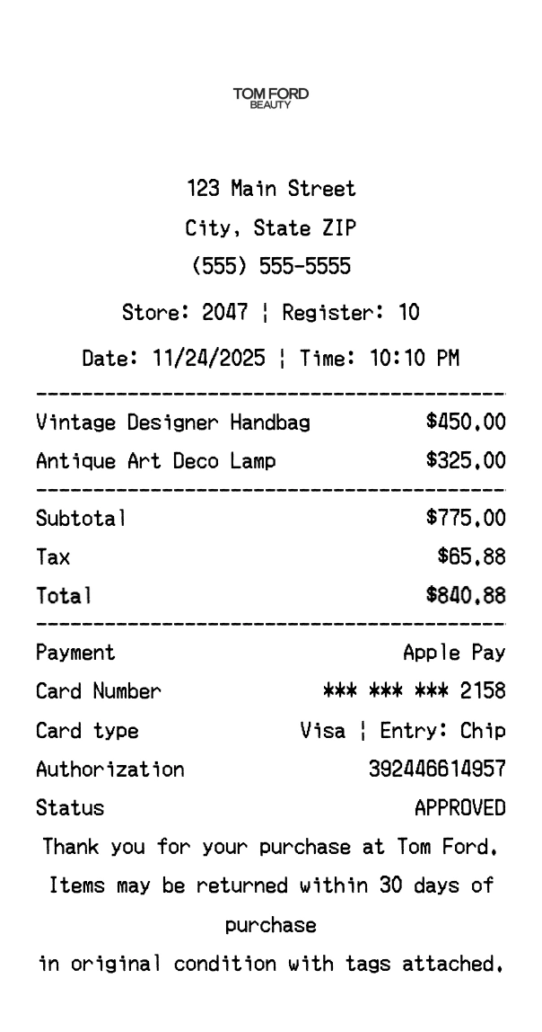 Create authentic Tom Ford receipts for luxury fashion purchases. Our free receipt generator tool helps you create professional, detailed receipts instantly. Perfect for business expense tracking, reimbursement requests, and personal documentation. Download high-quality PNG receipts in seconds, no signup required.