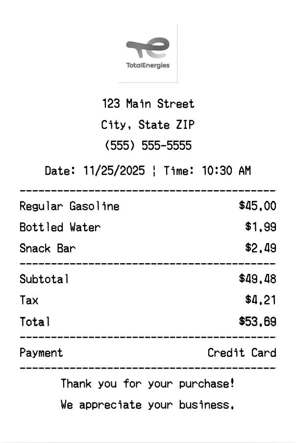 Create authentic TotalEnergies receipts instantly. Our free receipt generator produces professional gas station receipts with company logo, itemized purchases, tax calculations, and payment details. Perfect for expense tracking, reimbursement, and documentation. Download high-quality PNG receipts in seconds.