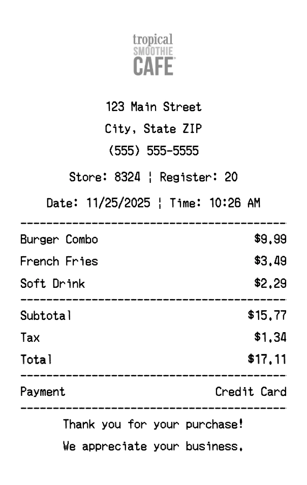 Create authentic Tropical Smoothie Cafe receipts for fast casual purchases. Our free receipt generator tool helps you create professional, detailed receipts instantly. Perfect for business expense tracking, reimbursement requests, and personal documentation. Download high-quality PNG receipts in seconds, no signup required.