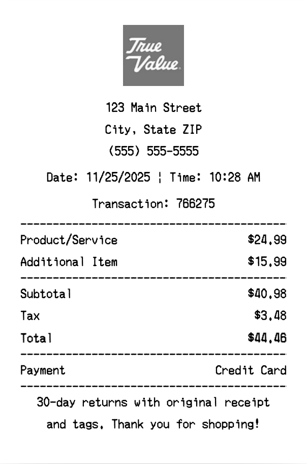 Our True Value receipt generator creates professional receipts that match the authentic True Value format. Each receipt includes the company logo, business information, transaction details, itemized purchase list, tax calculations, and payment information. All receipts are formatted to look exactly like real True Value receipts, making them perfect for expense reports, tax documentation, and reimbursement purposes.