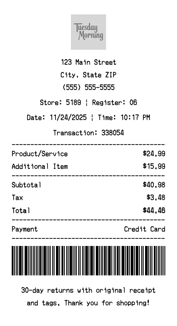 Create authentic Tuesday Morning receipts for discount retail purchases. Our free receipt generator tool helps you create professional, detailed receipts instantly. Perfect for business expense tracking, reimbursement requests, and personal documentation. Download high-quality PNG receipts in seconds, no signup required.