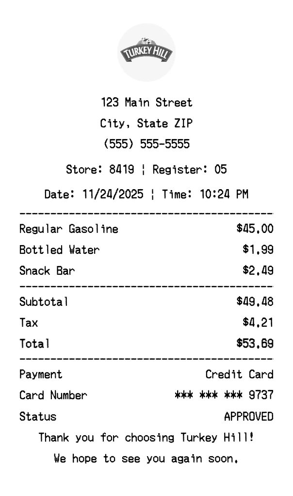 Create authentic Turkey Hill receipts instantly. Our free receipt generator produces professional convenience store receipts with company logo, itemized purchases, tax calculations, and payment details. Perfect for expense tracking, reimbursement, and documentation. Download high-quality PNG receipts in seconds.