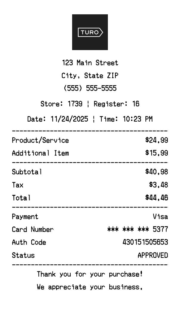 Our Turo receipt generator creates professional receipts that match the authentic Turo format. Each receipt includes the company logo, business information, transaction details, itemized purchase list, tax calculations, and payment information. All receipts are formatted to look exactly like real Turo receipts, making them perfect for expense reports, tax documentation, and reimbursement purposes.