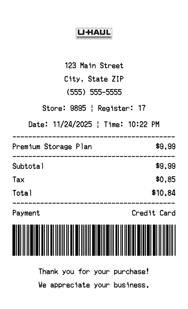 Create authentic U-Haul Storage receipts for storage purchases. Our free receipt generator tool helps you create professional, detailed receipts instantly. Perfect for business expense tracking, reimbursement requests, and personal documentation. Download high-quality PNG receipts in seconds, no signup required.