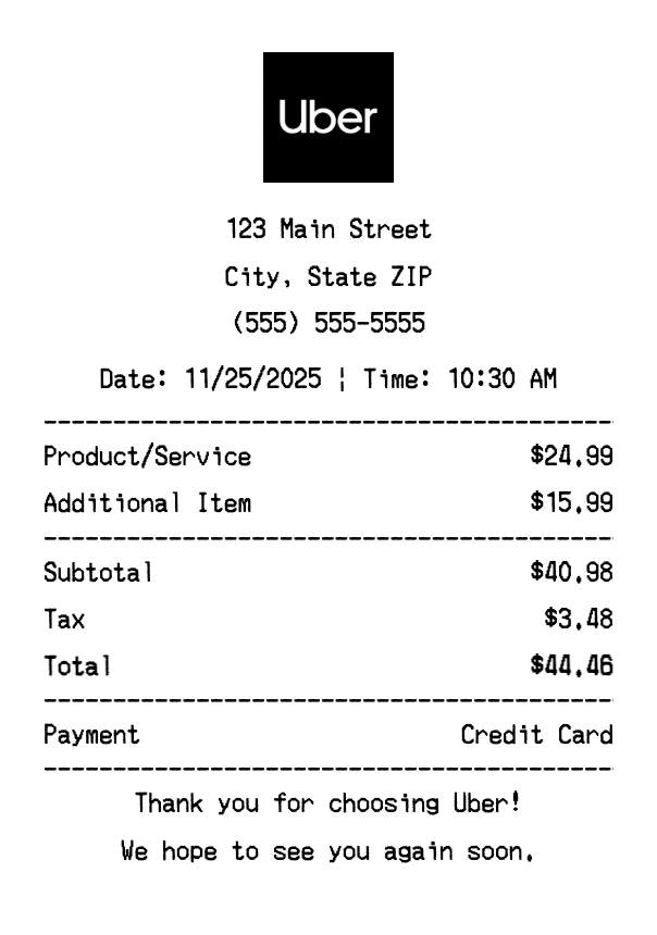 Our Uber receipt generator creates professional receipts that match the authentic Uber format. Each receipt includes the company logo, business information, transaction details, itemized purchase list, tax calculations, and payment information. All receipts are formatted to look exactly like real Uber receipts, making them perfect for expense reports, tax documentation, and reimbursement purposes.