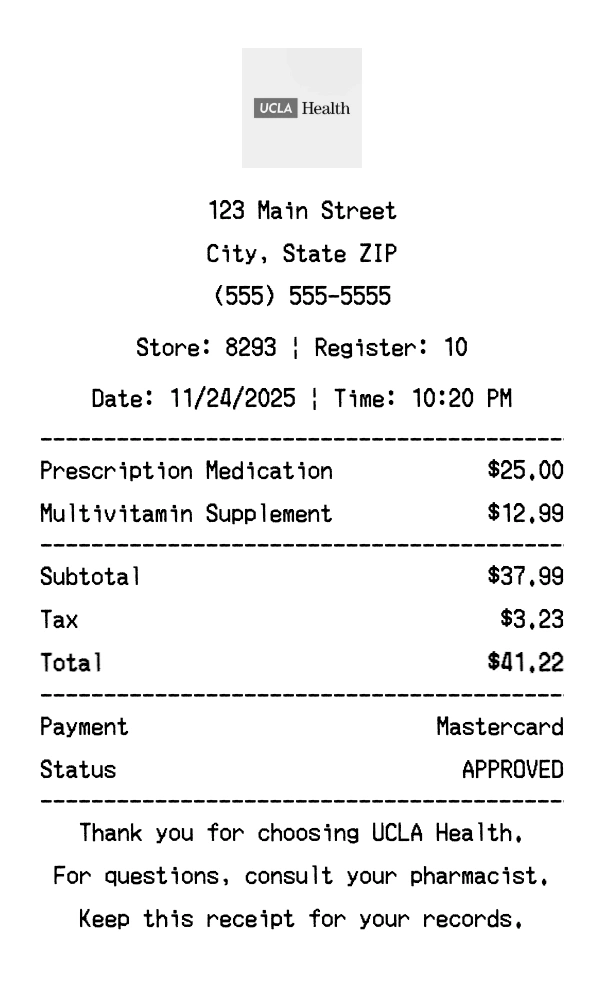 Create authentic UCLA Health receipts for healthcare purchases. Our free receipt generator tool helps you create professional, detailed receipts instantly. Perfect for business expense tracking, reimbursement requests, and personal documentation. Download high-quality PNG receipts in seconds, no signup required.