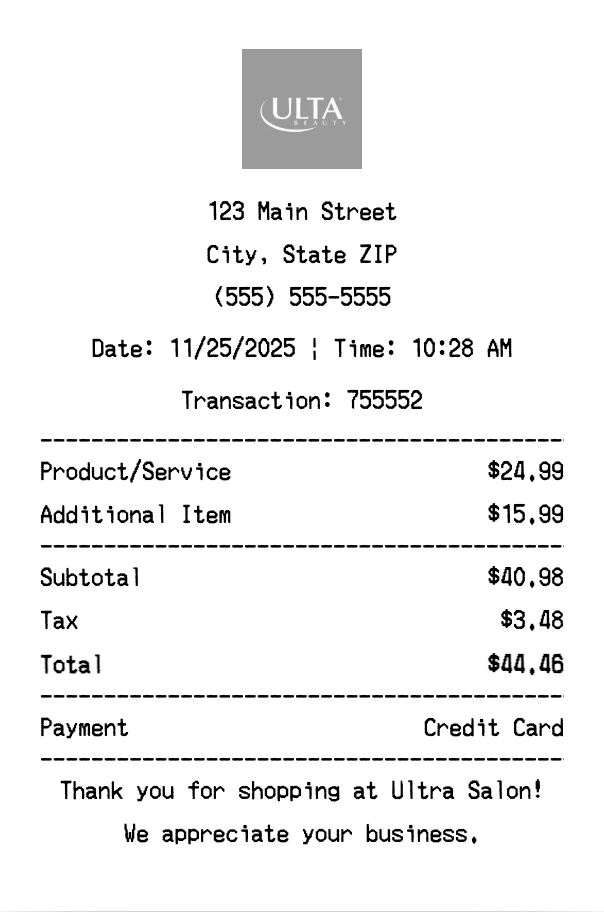 Create authentic Ultra Salon receipts for beauty purchases. Our free receipt generator tool helps you create professional, detailed receipts instantly. Perfect for business expense tracking, reimbursement requests, and personal documentation. Download high-quality PNG receipts in seconds, no signup required.