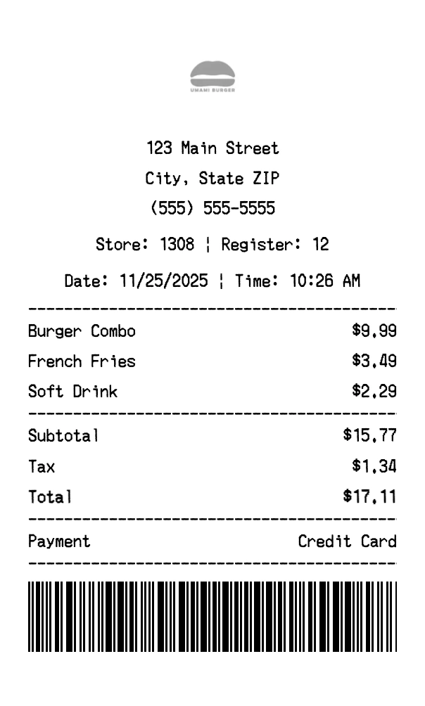 Create authentic Umami Burger receipts instantly. Our free receipt generator produces professional fast casual receipts with company logo, itemized purchases, tax calculations, and payment details. Perfect for expense tracking, reimbursement, and documentation. Download high-quality PNG receipts in seconds.