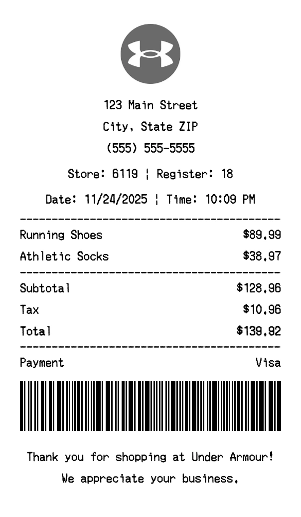Create authentic Under Armour receipts for athletic apparel purchases. Our free receipt generator tool helps you create professional, detailed receipts instantly. Perfect for business expense tracking, reimbursement requests, and personal documentation. Download high-quality PNG receipts in seconds, no signup required.