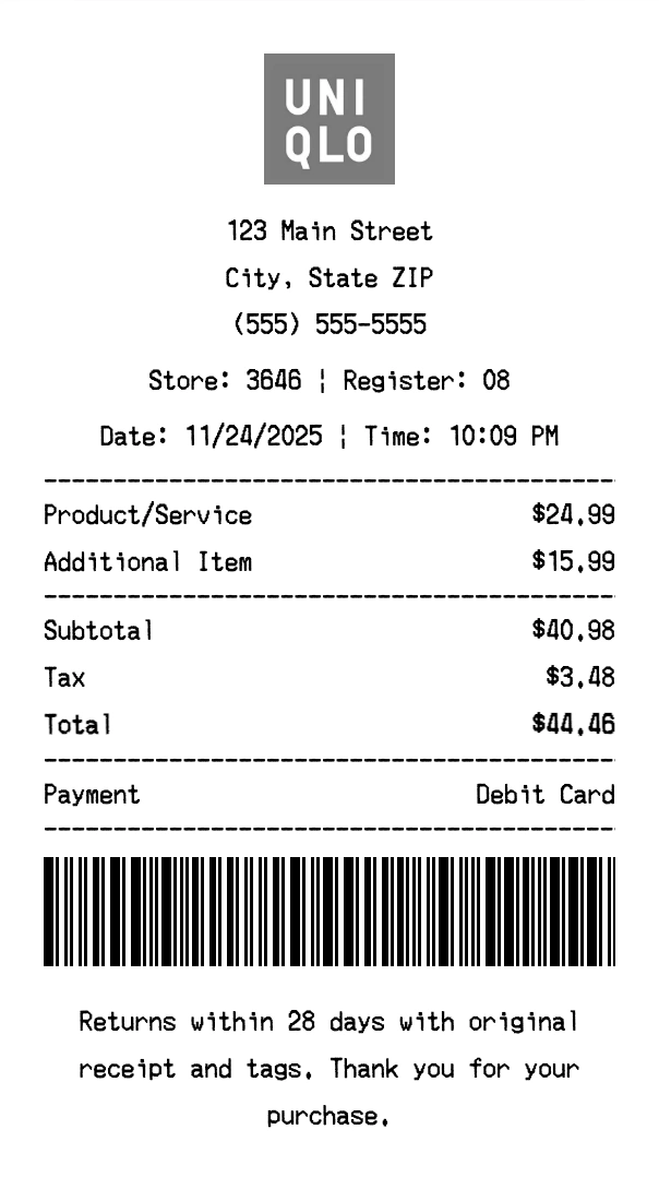 Create authentic Uniqlo receipts for fashion purchases. Our free receipt generator tool helps you create professional, detailed receipts instantly. Perfect for business expense tracking, reimbursement requests, and personal documentation. Download high-quality PNG receipts in seconds, no signup required.