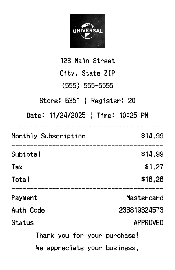 Create authentic Universal Pictures receipts instantly. Our free receipt generator produces professional streaming receipts with company logo, itemized purchases, tax calculations, and payment details. Perfect for expense tracking, reimbursement, and documentation. Download high-quality PNG receipts in seconds.