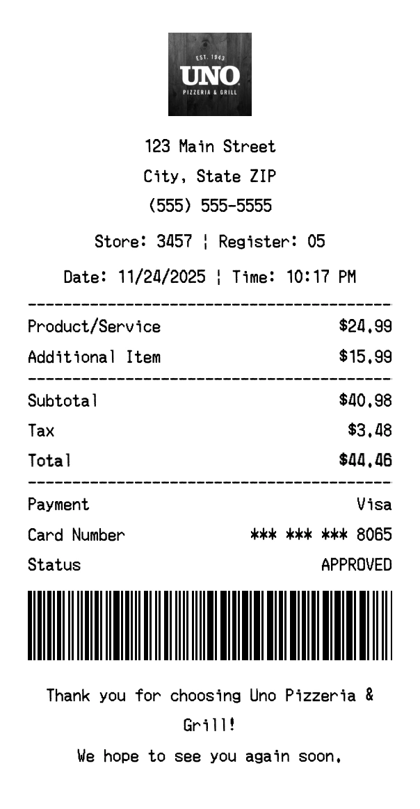 Create Uno Pizzeria & Grill Receipt