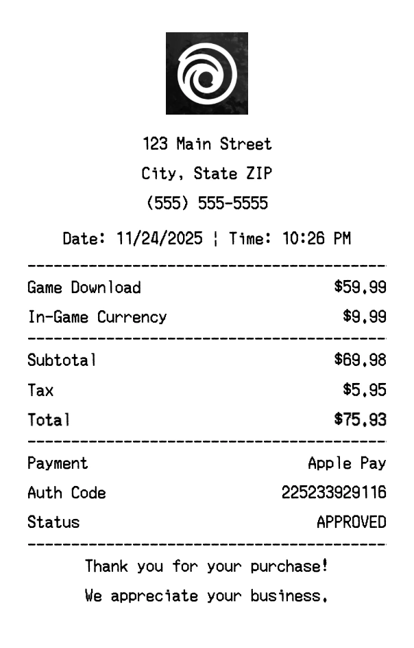 Create authentic Uplay receipts instantly. Our free receipt generator produces professional gaming receipts with company logo, itemized purchases, tax calculations, and payment details. Perfect for expense tracking, reimbursement, and documentation. Download high-quality PNG receipts in seconds.