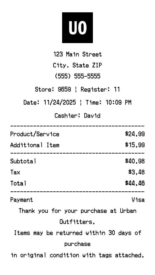 Create authentic Urban Outfitters receipts instantly. Our free receipt generator produces professional fashion receipts with company logo, itemized purchases, tax calculations, and payment details. Perfect for expense tracking, reimbursement, and documentation. Download high-quality PNG receipts in seconds.
