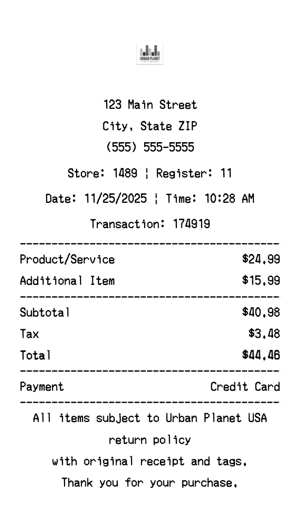 Create authentic Urban Planet USA receipts instantly. Our free receipt generator produces professional fashion receipts with company logo, itemized purchases, tax calculations, and payment details. Perfect for expense tracking, reimbursement, and documentation. Download high-quality PNG receipts in seconds.