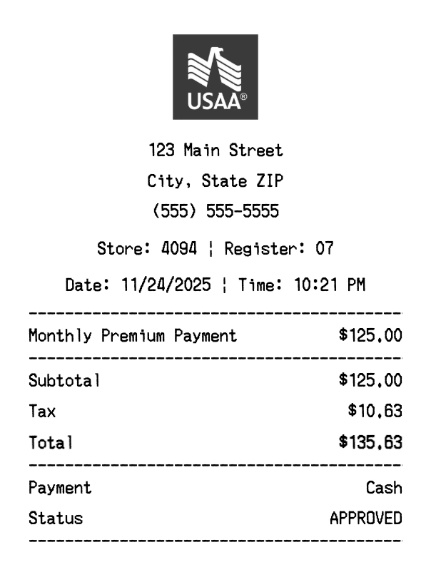 Create authentic USAA receipts instantly. Our free receipt generator produces professional insurance receipts with company logo, itemized purchases, tax calculations, and payment details. Perfect for expense tracking, reimbursement, and documentation. Download high-quality PNG receipts in seconds.