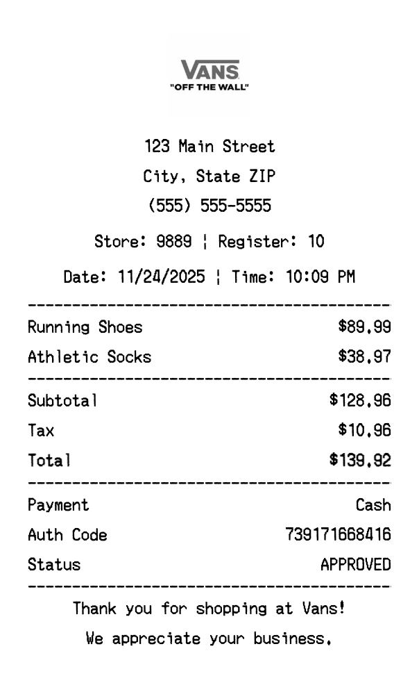 Create authentic Vans receipts instantly. Our free receipt generator produces professional athletic apparel receipts with company logo, itemized purchases, tax calculations, and payment details. Perfect for expense tracking, reimbursement, and documentation. Download high-quality PNG receipts in seconds.