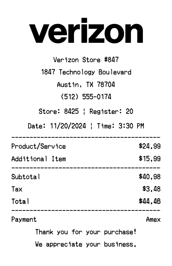 Our Verizon receipt generator creates professional receipts that match the authentic Verizon format. Each receipt includes the company logo, business information, transaction details, itemized purchase list, tax calculations, and payment information. All receipts are formatted to look exactly like real Verizon receipts, making them perfect for expense reports, tax documentation, and reimbursement purposes.