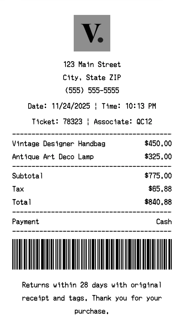 Create authentic Vestiaire Collective receipts instantly. Our free receipt generator produces professional luxury e-commerce receipts with company logo, itemized purchases, tax calculations, and payment details. Perfect for expense tracking, reimbursement, and documentation. Download high-quality PNG receipts in seconds.