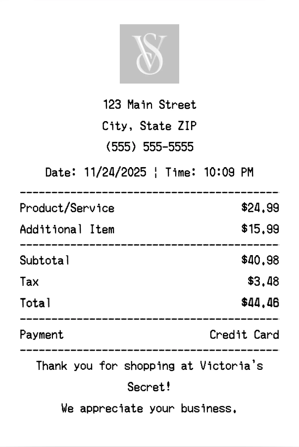 Create authentic Victoria's Secret receipts for apparel purchases. Our free receipt generator tool helps you create professional, detailed receipts instantly. Perfect for business expense tracking, reimbursement requests, and personal documentation. Download high-quality PNG receipts in seconds, no signup required.