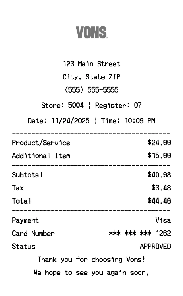 Our Vons receipt generator creates professional receipts that match the authentic Vons format. Each receipt includes the company logo, business information, transaction details, itemized purchase list, tax calculations, and payment information. All receipts are formatted to look exactly like real Vons receipts, making them perfect for expense reports, tax documentation, and reimbursement purposes.