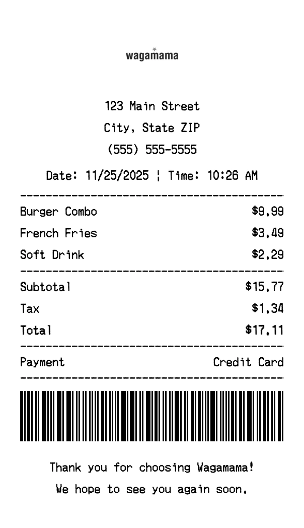 Create authentic Wagamama receipts for fast casual purchases. Our free receipt generator tool helps you create professional, detailed receipts instantly. Perfect for business expense tracking, reimbursement requests, and personal documentation. Download high-quality PNG receipts in seconds, no signup required.
