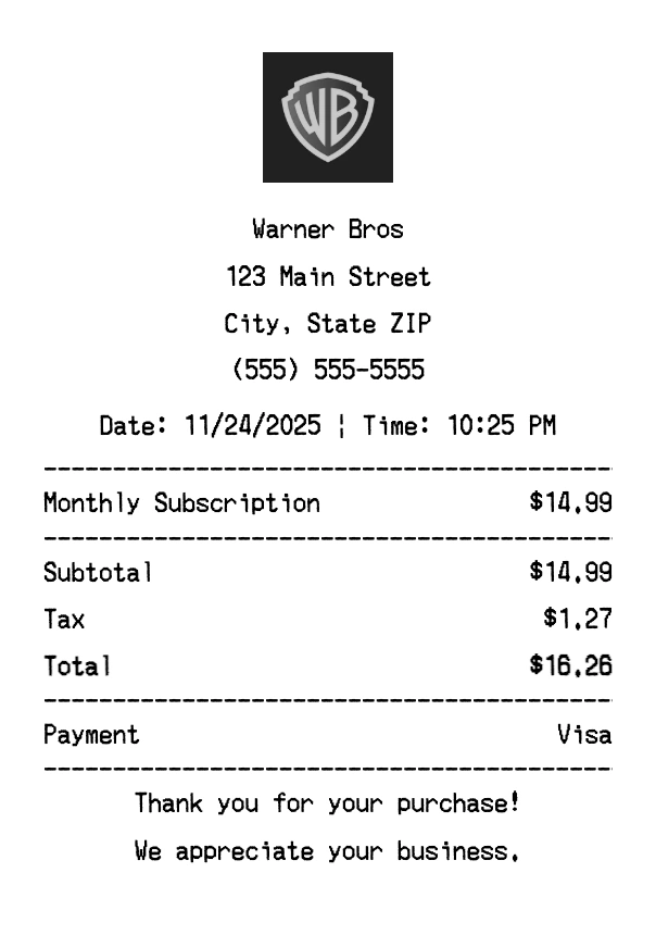 Create authentic Warner Bros receipts instantly. Our free receipt generator produces professional streaming receipts with company logo, itemized purchases, tax calculations, and payment details. Perfect for expense tracking, reimbursement, and documentation. Download high-quality PNG receipts in seconds.