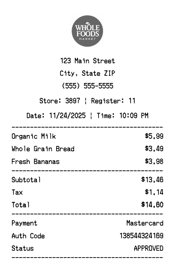 Create authentic Whole Foods receipts for grocery store purchases. Our free receipt generator tool helps you create professional, detailed receipts instantly. Perfect for business expense tracking, reimbursement requests, and personal documentation. Download high-quality PNG receipts in seconds, no signup required.